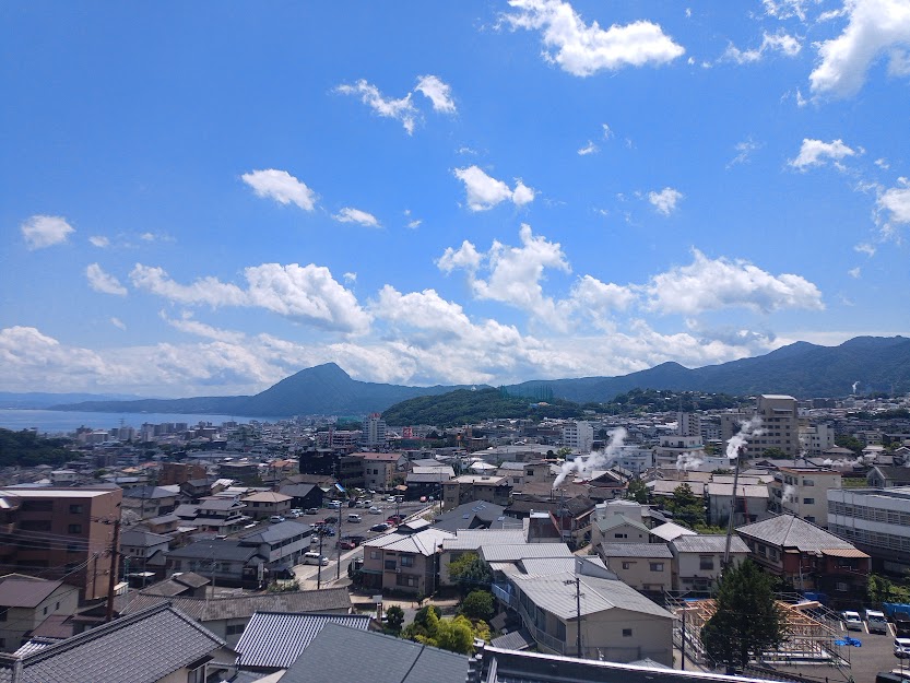 (高台からの別府の街並み。湯煙が街のアクセント)